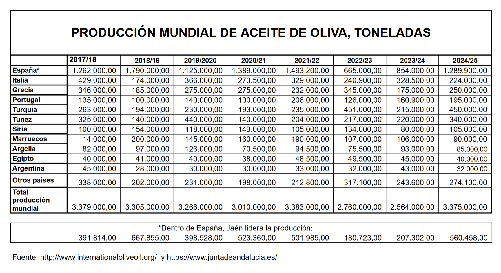 Cuadro con la Producción mundial de aceite de oliva, Toneladas.