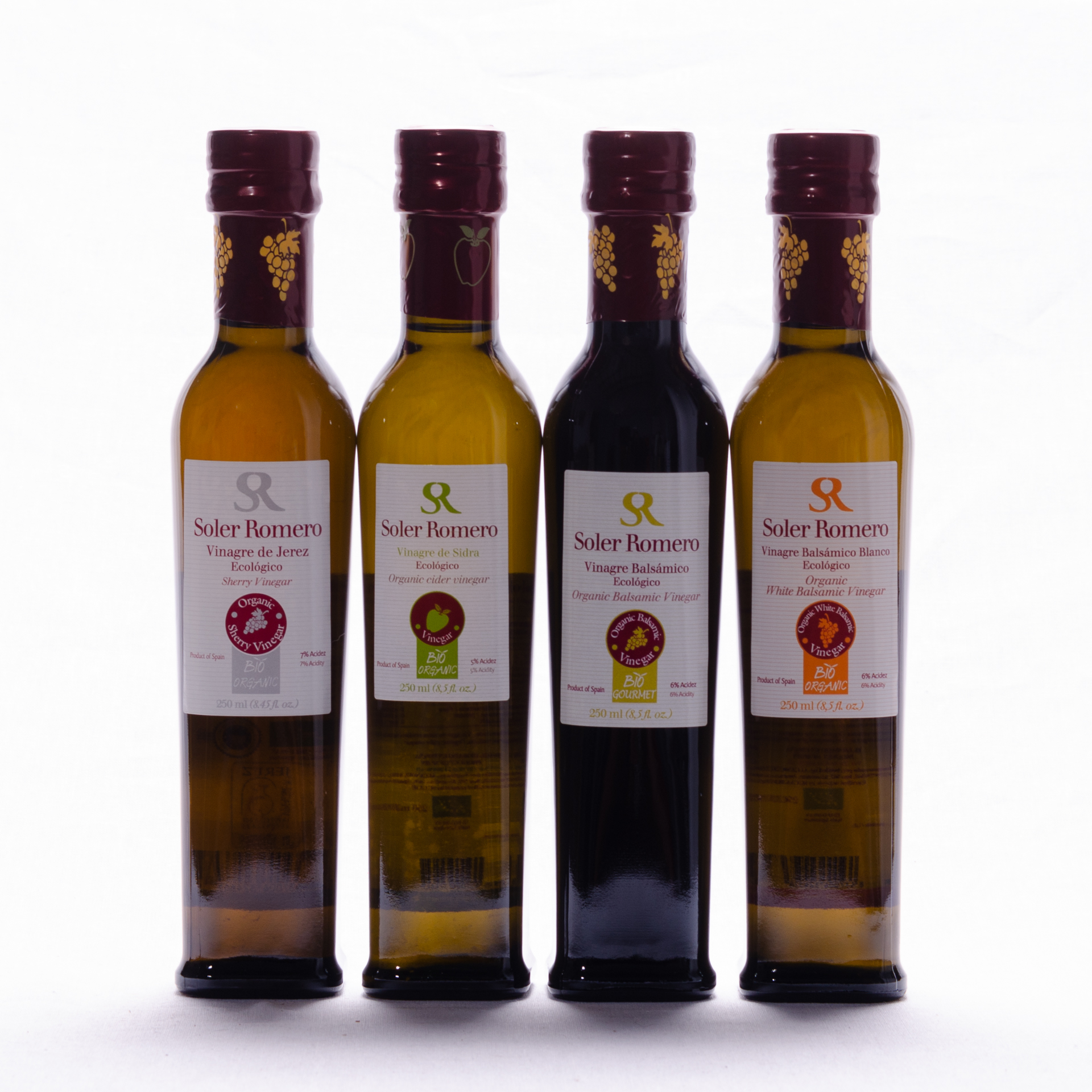 Como complemento ideal de nuestro aceite, Soler Romero ofrece cuatro variedades de vinagres ecológicos: balsámico, balsámico blanco, de sidra y de Jerez. El secreto de nuestros vinagres es la combinación de excepcional materia prima, el esmerado proceso de elaboración sin aditivos ni azucares, y el envejecido en barricas de roble americano y francés.